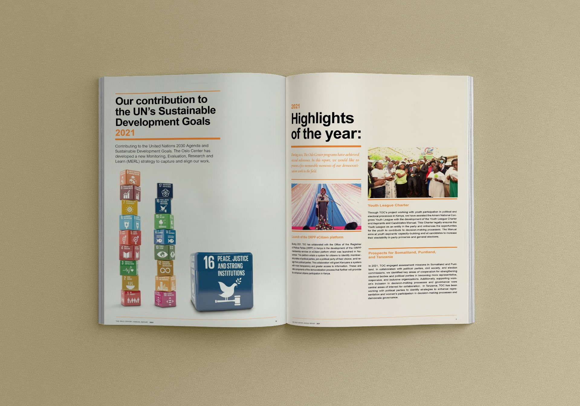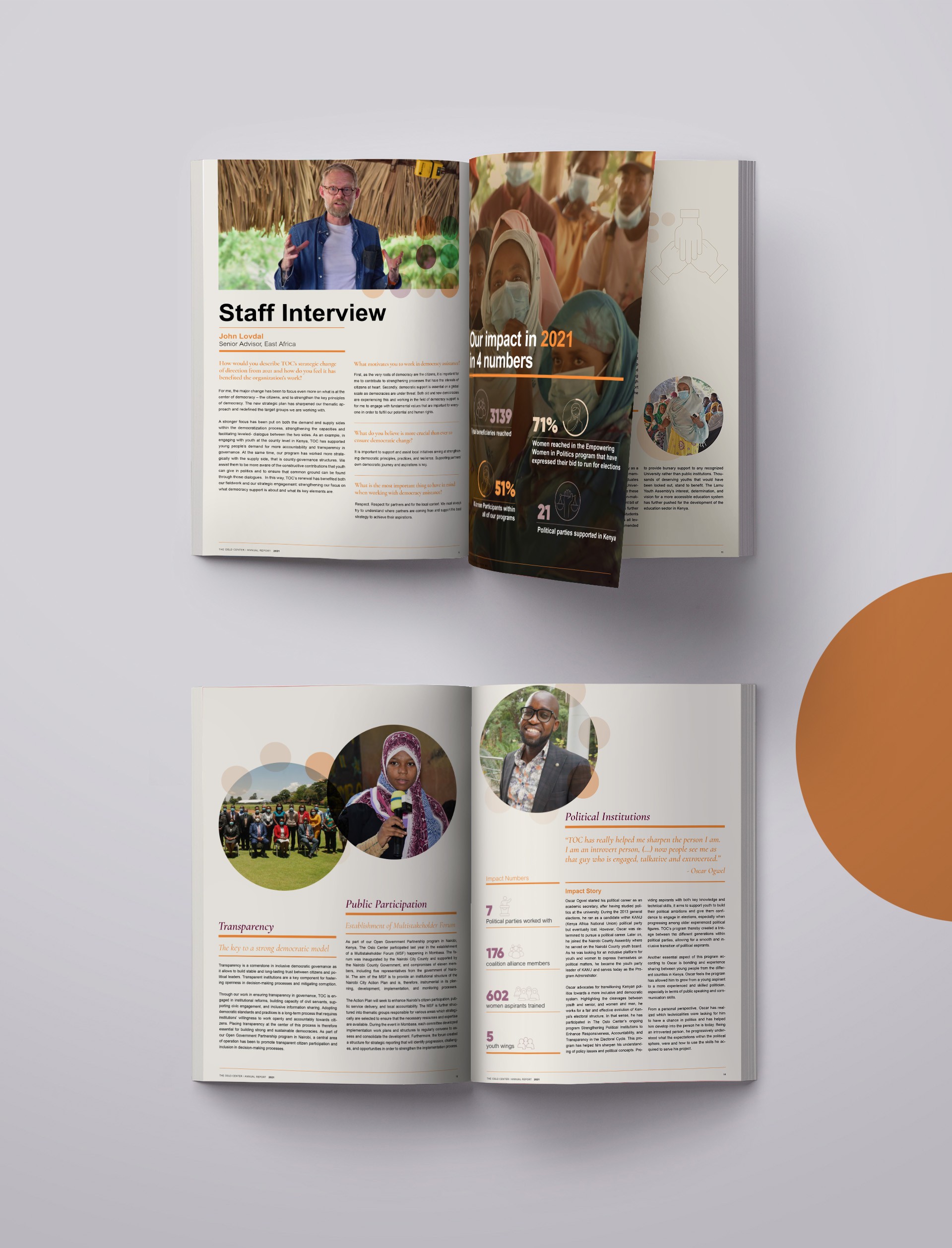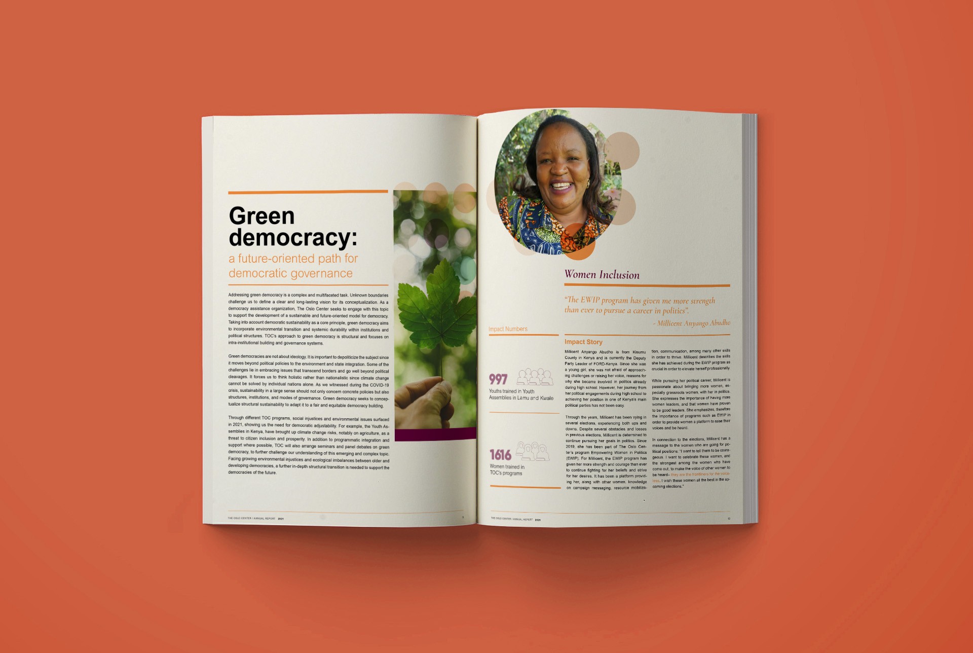Besides promoting democratic governance, TOC works as well in promoting more “Green democracy”. so in the spirit of expressing a brand’s beliefs + values in every moment, these printed materials were a great opportunity to manifest this new brand direction and bring those beliefs to life. The opportunity here was to use these public facing materials to express the storytelling, emotion and intention of the great work they do at home and in other parts of the world. We wanted to balance the humility of Scandinavian sensibilities with a warmer and more emotional (design) face on the work they do and a new accessibility to the more personal impact stories they tell.