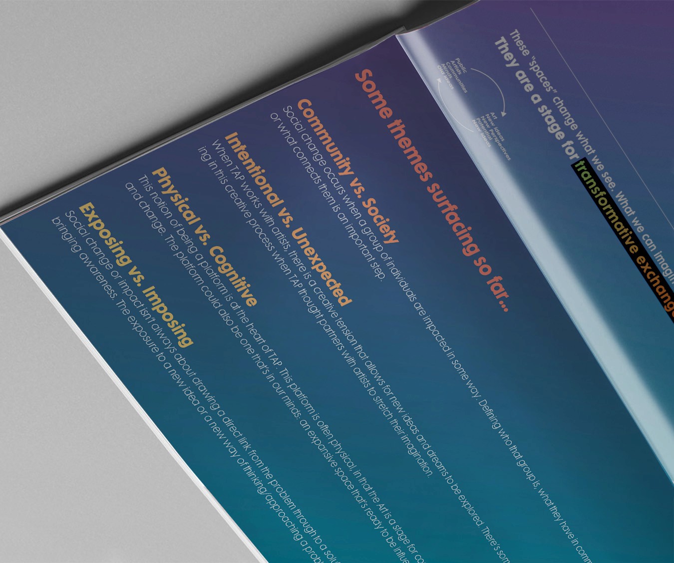 So as a nonprofit, it would need to be able to translate its art world voice into more accessible language for growing donation and support. A change in conversation was needed, to talk more about what impact their work has on our world. To reposition TAP as a nonprofit, would mean understanding its impact on community through the lens of a mission and find clear language to explain its intangible impact of art on society.